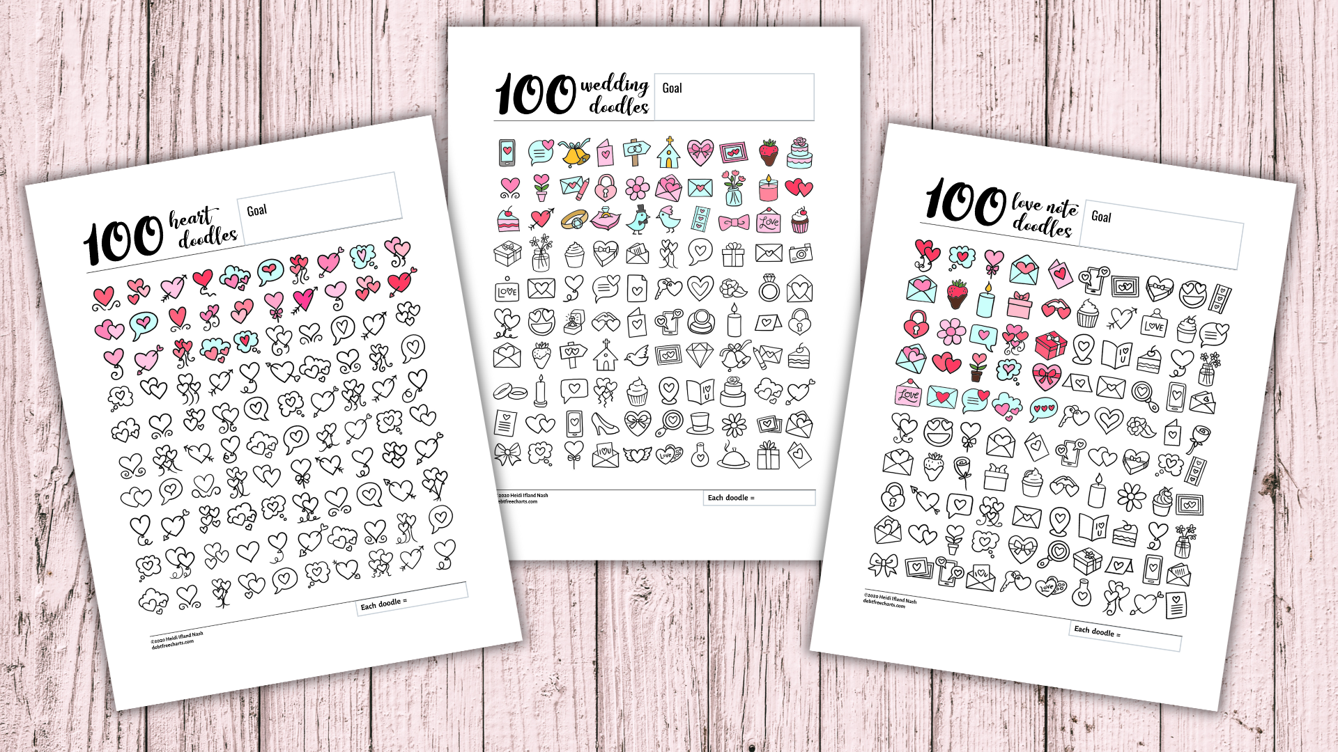 Love & Hearts Doodle Tracking Chart Set: This set comes with three versions! One sheet is of hearts, the other is of items you’d find on a love note, and the last page is of wedding doodles.